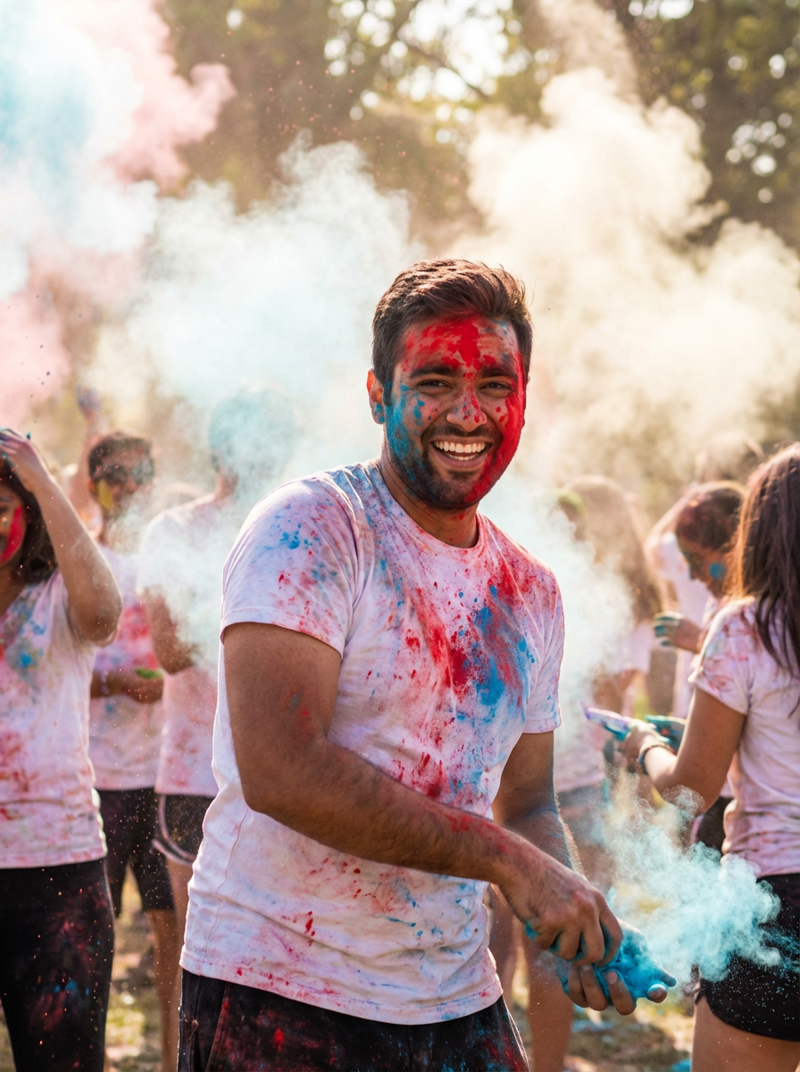 a stunning model surrounded by clouds of red and blue colors being thrown, capturing the sense of community and celebration during the festival of colors