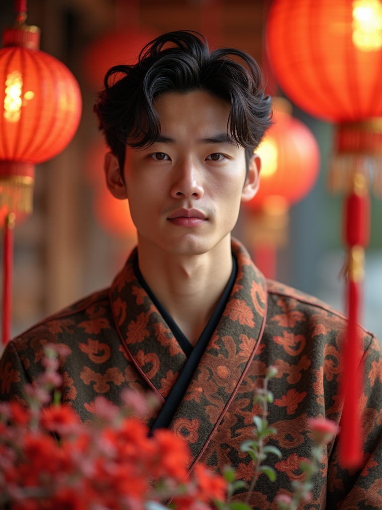 a stunning model surrounded by traditional decorations and symbols, capturing the sense of renewal and family connection during the Spring Festival