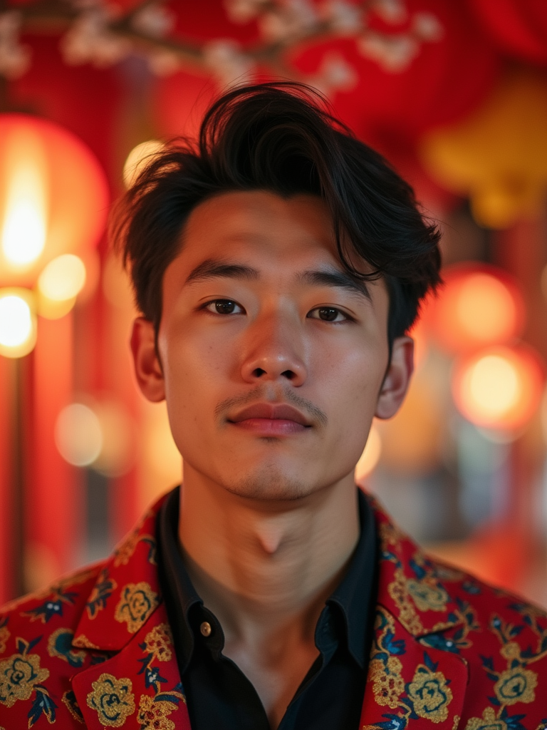 a stunning model surrounded by traditional decorations and symbols, capturing the sense of renewal and family connection during the Spring Festival