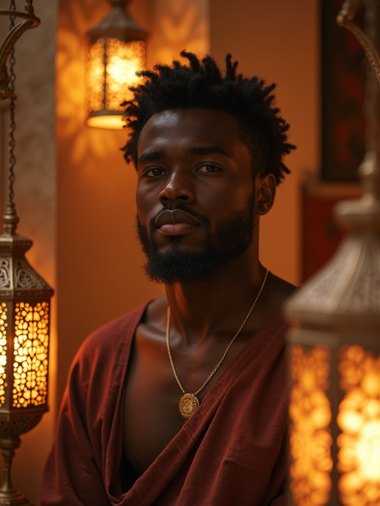a stunning model surrounded by traditional lanterns and Islamic art, capturing the sense of peace and spiritual connection during the holy month