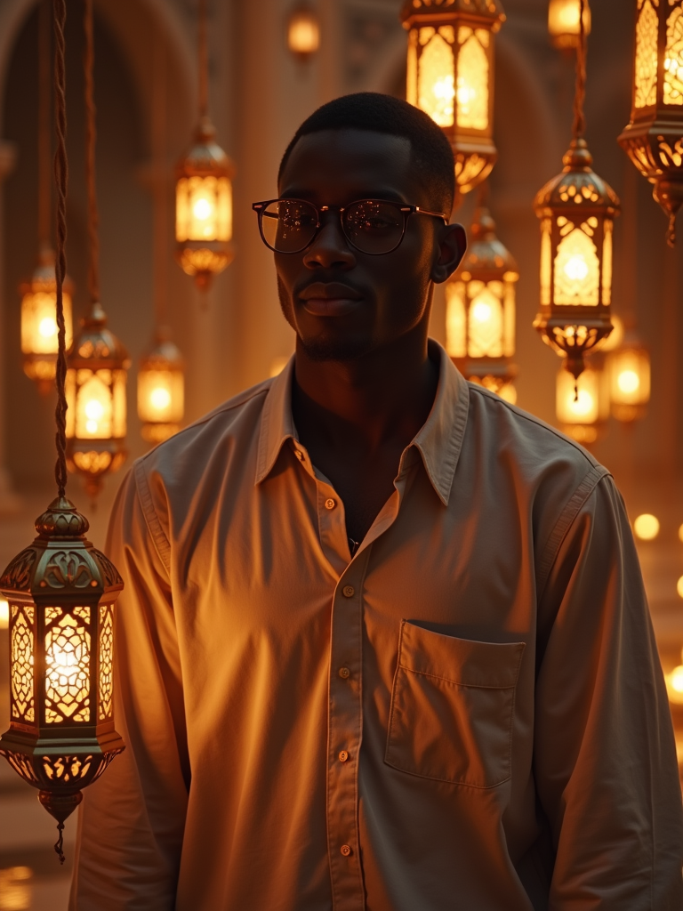 a stunning model surrounded by traditional lanterns and Islamic art, capturing the sense of peace and spiritual connection during the holy month