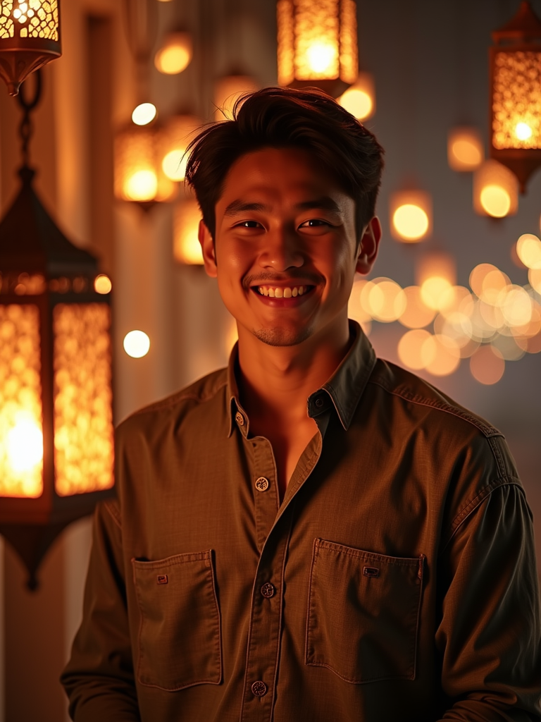 a stunning model surrounded by traditional lanterns and Islamic art, capturing the sense of joy and family connection during the holiday