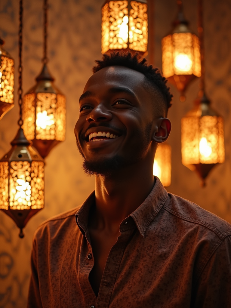 a stunning model surrounded by traditional lanterns and Islamic art, capturing the sense of joy and family connection during the holiday