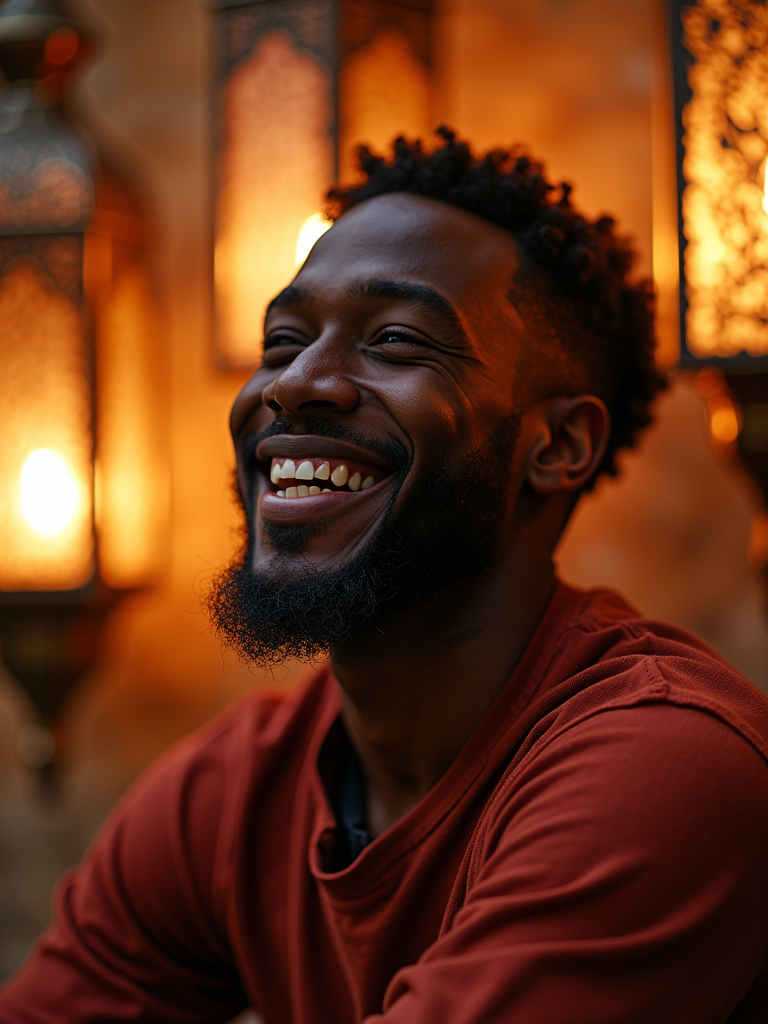 a stunning model surrounded by traditional lanterns and Islamic art, capturing the sense of joy and family connection during the holiday