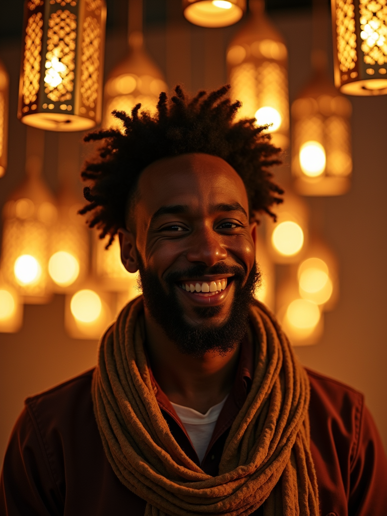 a stunning model surrounded by traditional lanterns and Islamic art, capturing the sense of joy and family connection during the holiday