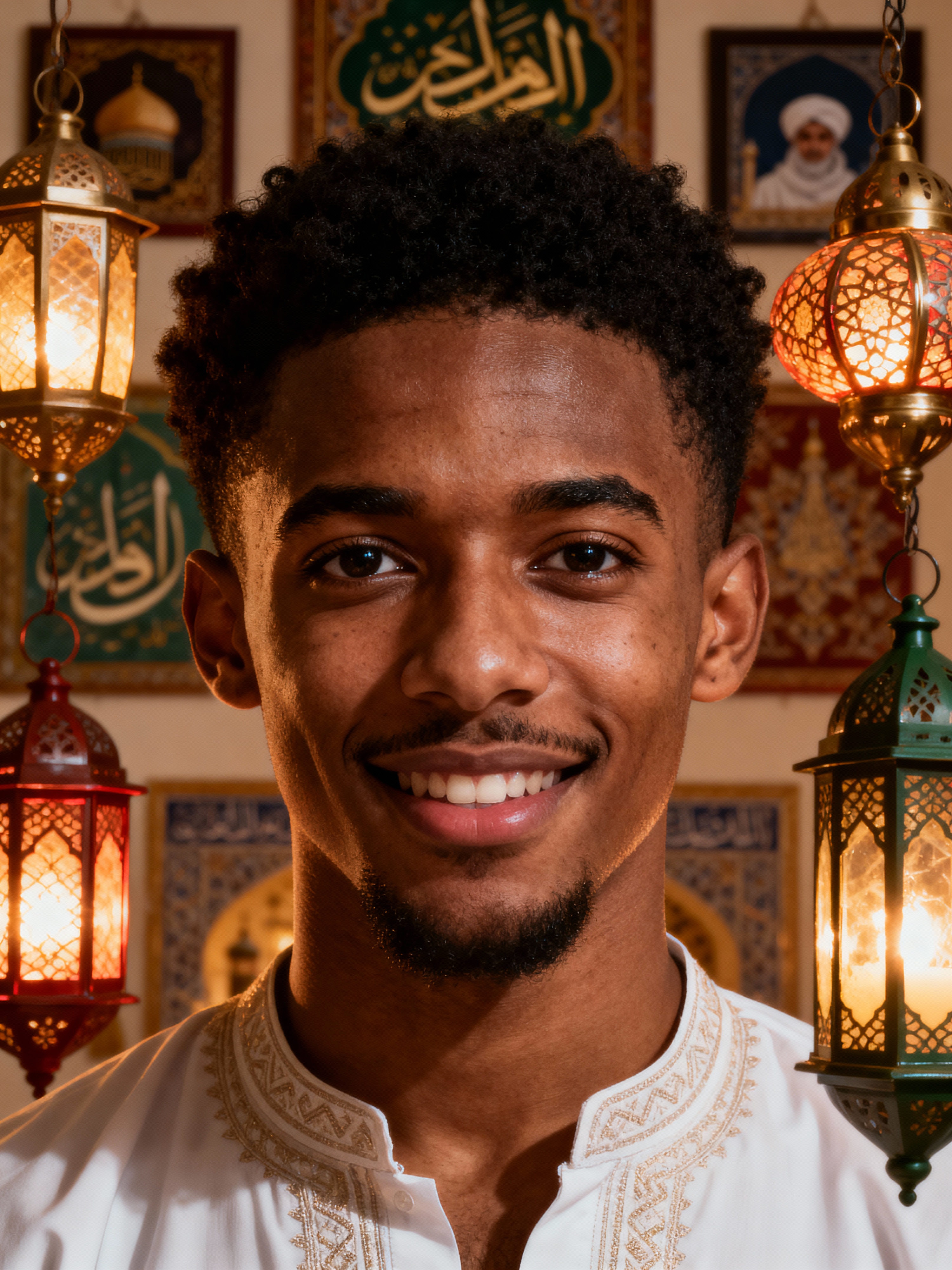a stunning model surrounded by traditional lanterns and Islamic art, capturing the sense of joy and family connection during the holiday