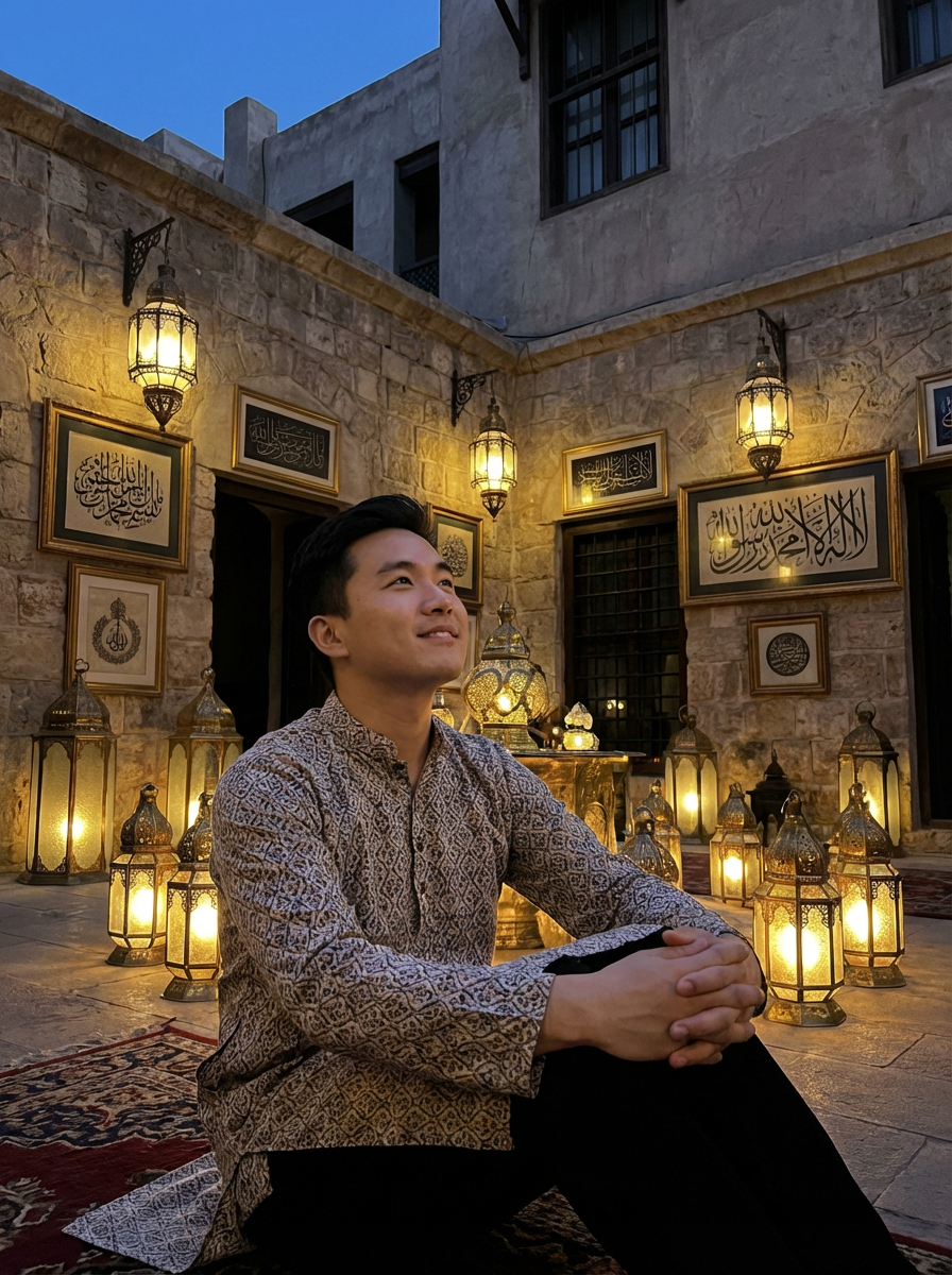 a stunning model surrounded by traditional lanterns and Islamic art, capturing the sense of peace and spiritual connection during the holy month