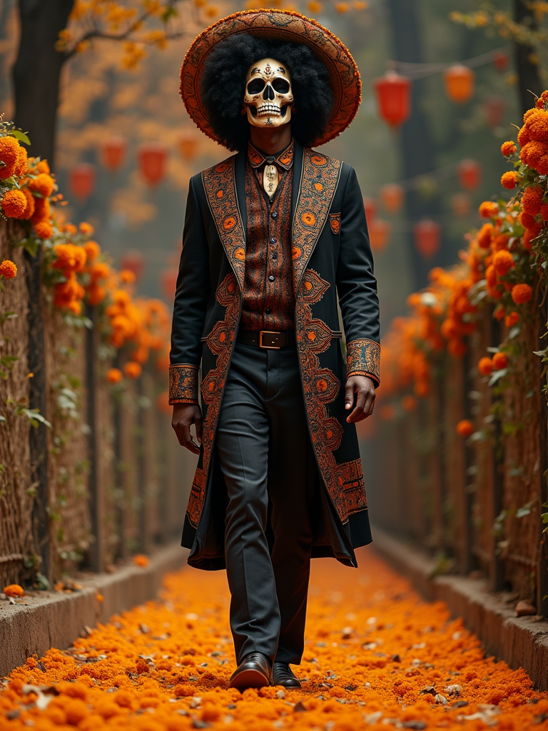 a stunning model surrounded by traditional symbols and marigold paths, capturing the sense of remembrance and family connection during Día de los Muertos