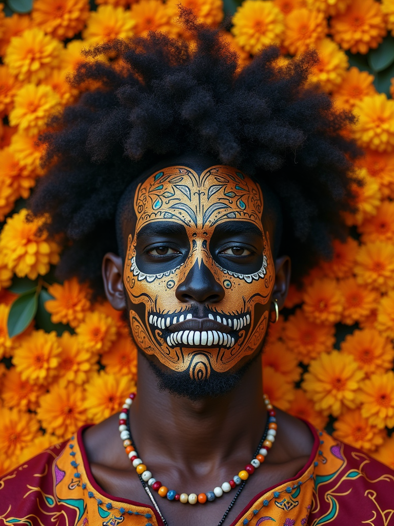 a stunning model surrounded by traditional symbols and marigold paths, capturing the sense of remembrance and family connection during Día de los Muertos