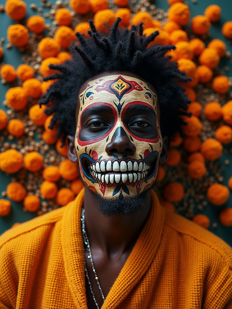 a stunning model surrounded by traditional symbols and marigold paths, capturing the sense of remembrance and family connection during Día de los Muertos