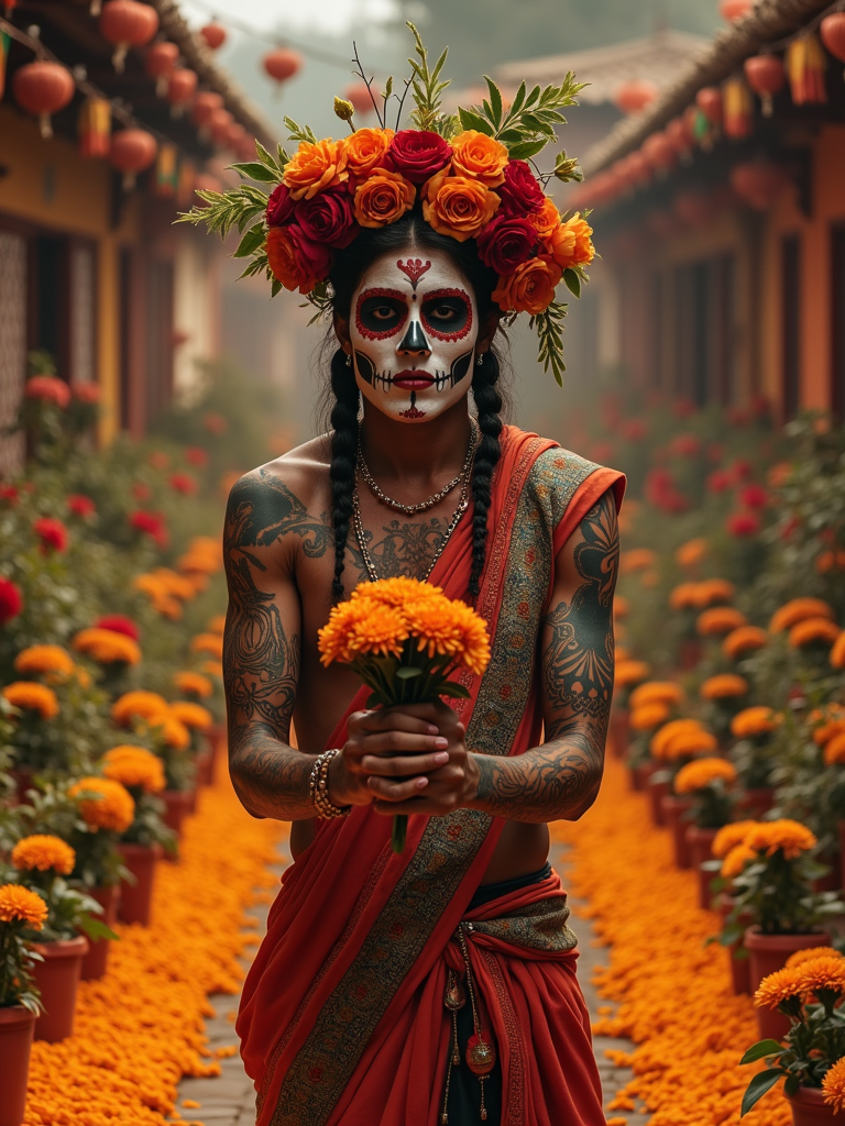 a stunning model surrounded by traditional symbols and marigold paths, capturing the sense of remembrance and family connection during Día de los Muertos