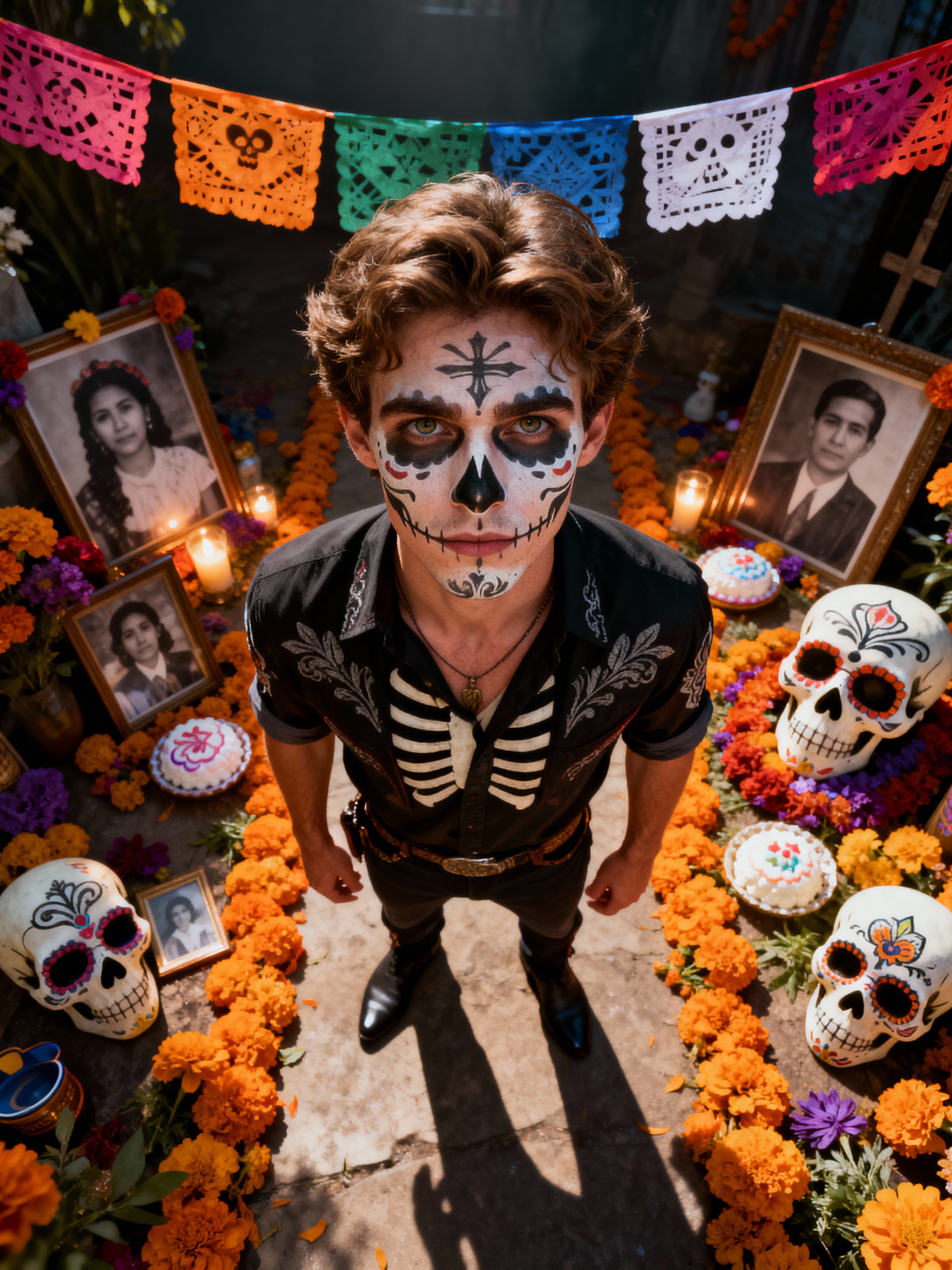 a stunning model surrounded by traditional symbols and marigold paths, capturing the sense of remembrance and family connection during Día de los Muertos