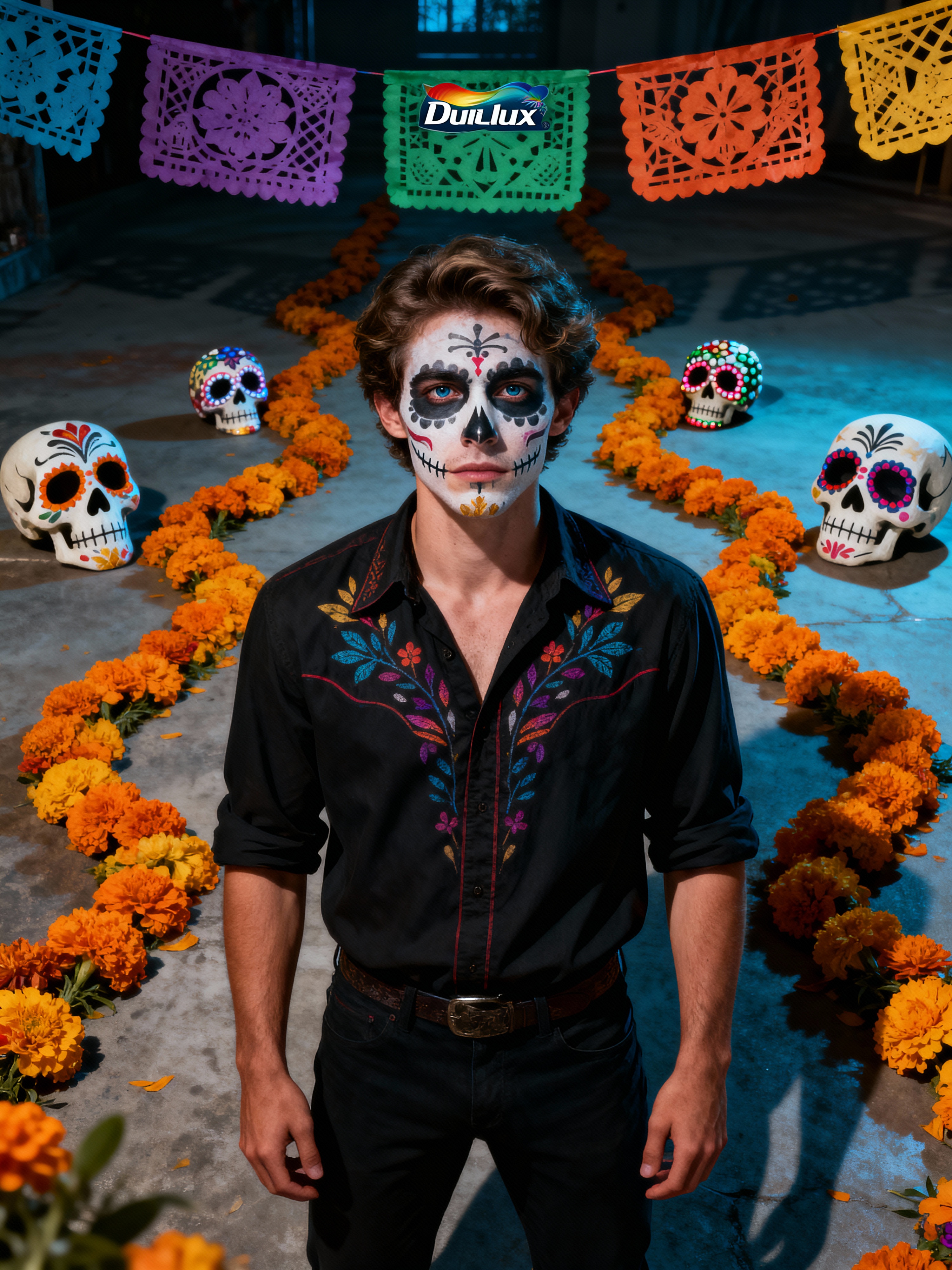 a stunning model surrounded by traditional symbols and marigold paths, capturing the sense of remembrance and family connection during Día de los Muertos