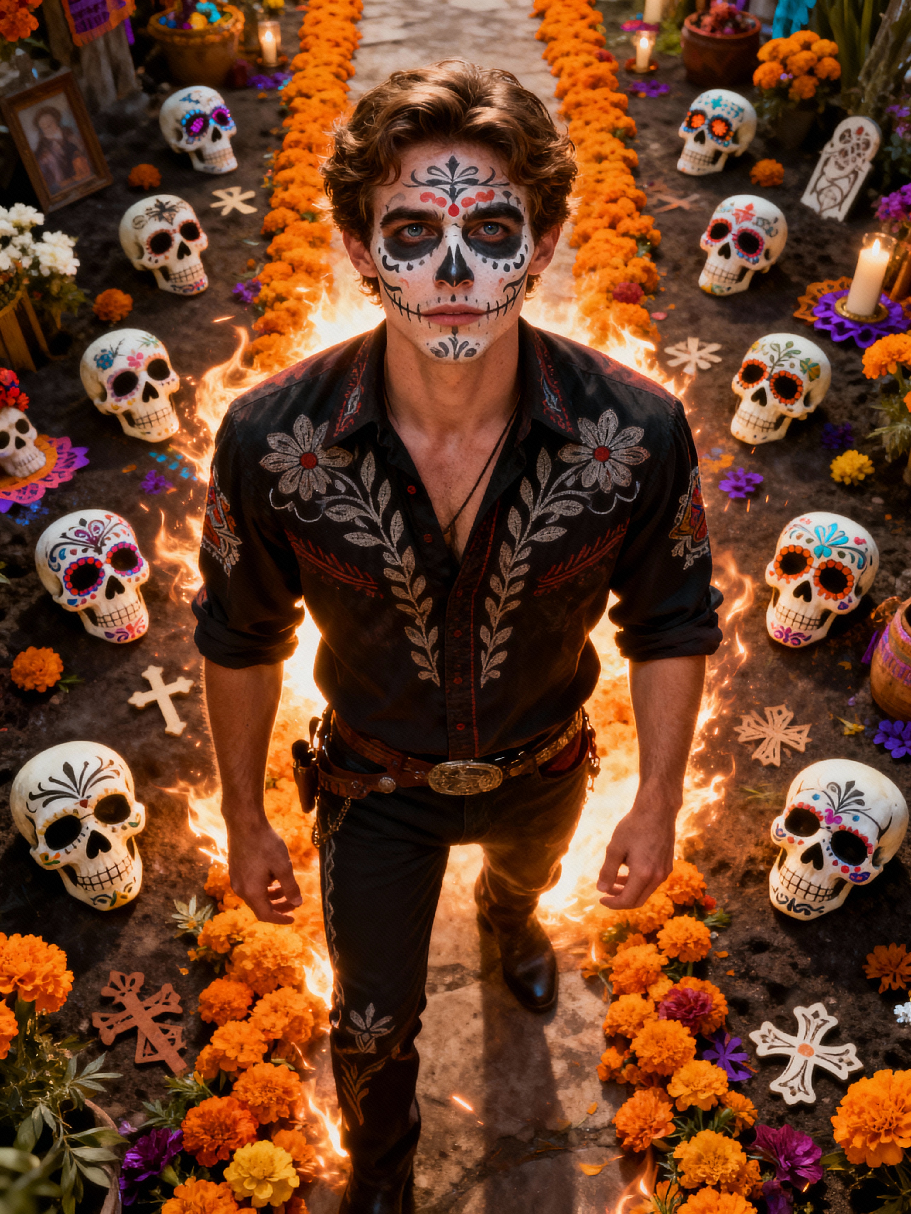 a stunning model surrounded by traditional symbols and marigold paths, capturing the sense of remembrance and family connection during Día de los Muertos