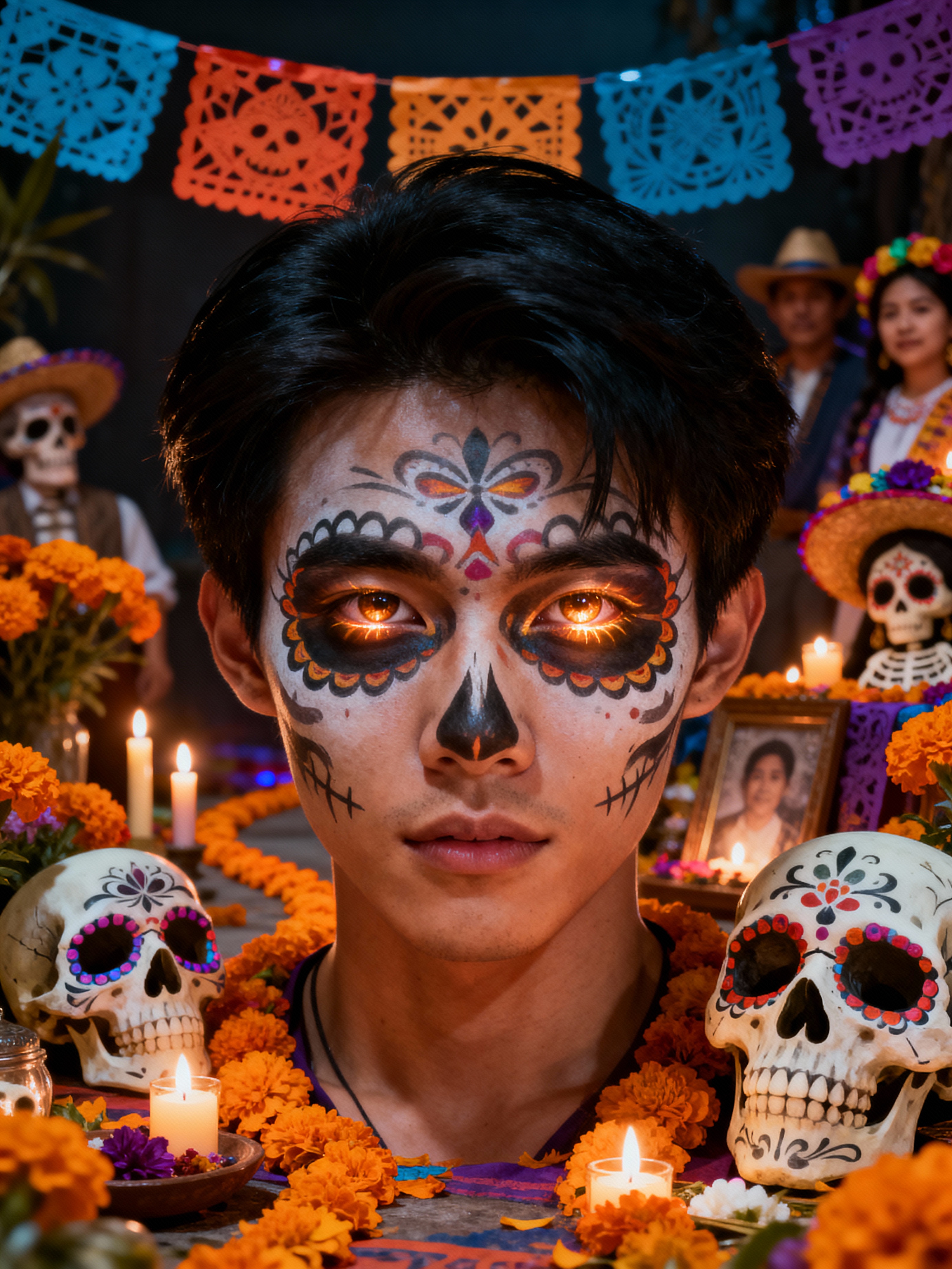 Related photosa man with  a respectful look while participating in a candlelight vigil, adding a meaningful quality to their celebration, with sugar skulls and papel picado visible in the backgrounda man with  a respectful look while participating in a candlelight vigil, adding a meaningful quality to their celebration, with sugar skulls and papel picado visible in the backgrounda man with  a respectful look while participating in a candlelight vigil, adding a meaningful quality to their celebration, with sugar skulls and papel picado visible in the backgroundsharp and trendy man in Berlin wearing a grunge-inspired outfit, Berlin Wall in the backgrounda man with  a tribal face paint design, adding an element of tribal and cultural inspiration to their festival lookwide shot painting of woman, ultra realistic, concept art