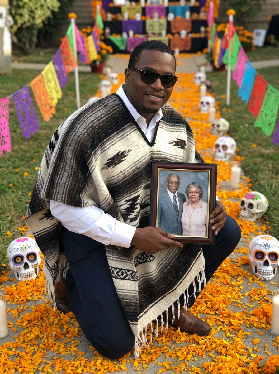 a stunning model surrounded by traditional symbols and marigold paths, capturing the sense of remembrance and family connection during Día de los Muertos