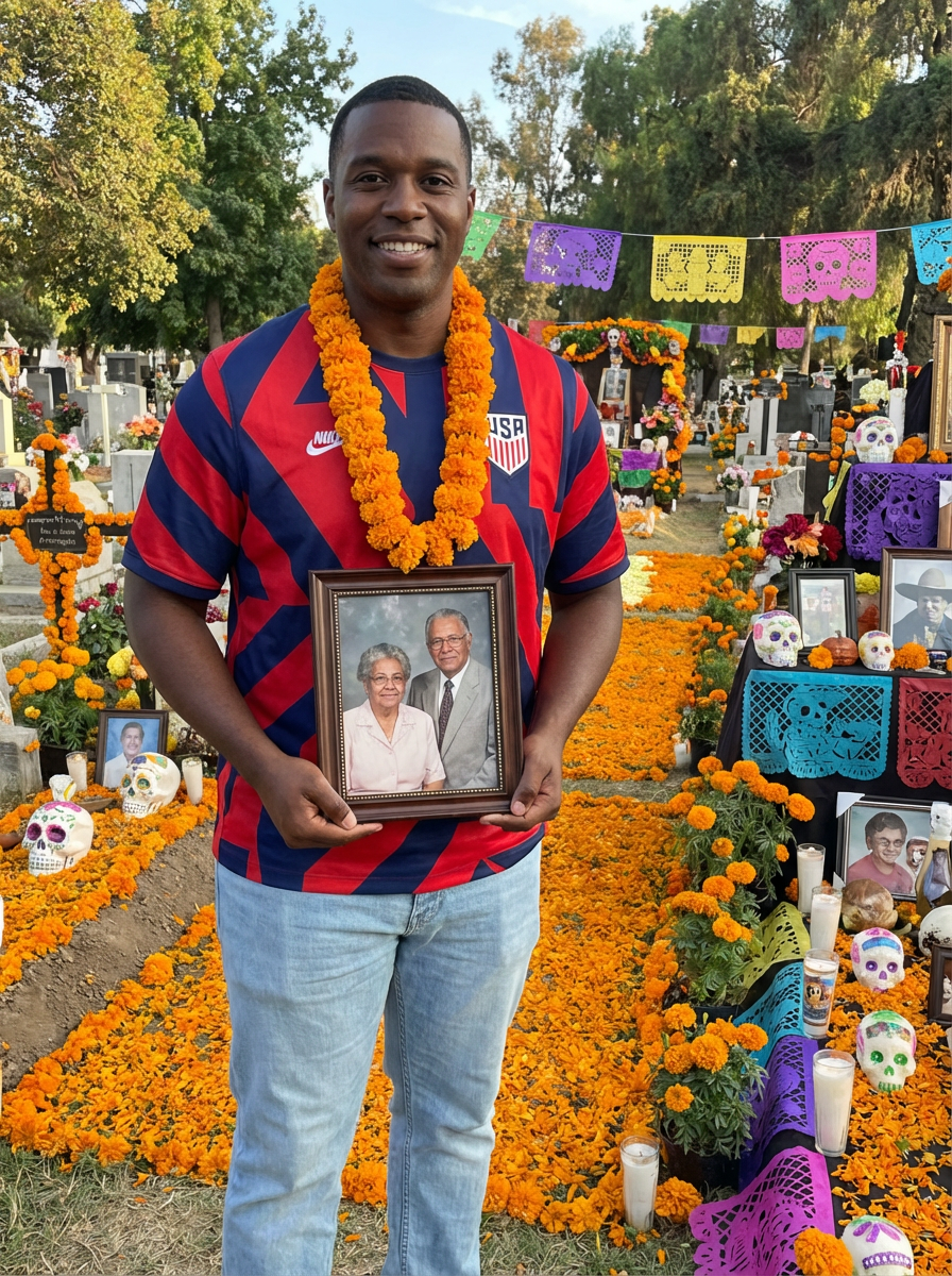 a stunning model surrounded by traditional symbols and marigold paths, capturing the sense of remembrance and family connection during Día de los Muertos