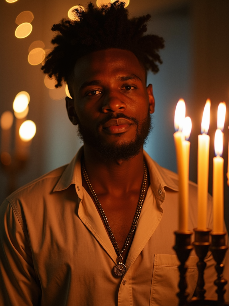 a stunning model surrounded by traditional symbols and menorahs, capturing the sense of miracle and family connection during the Festival of Lights