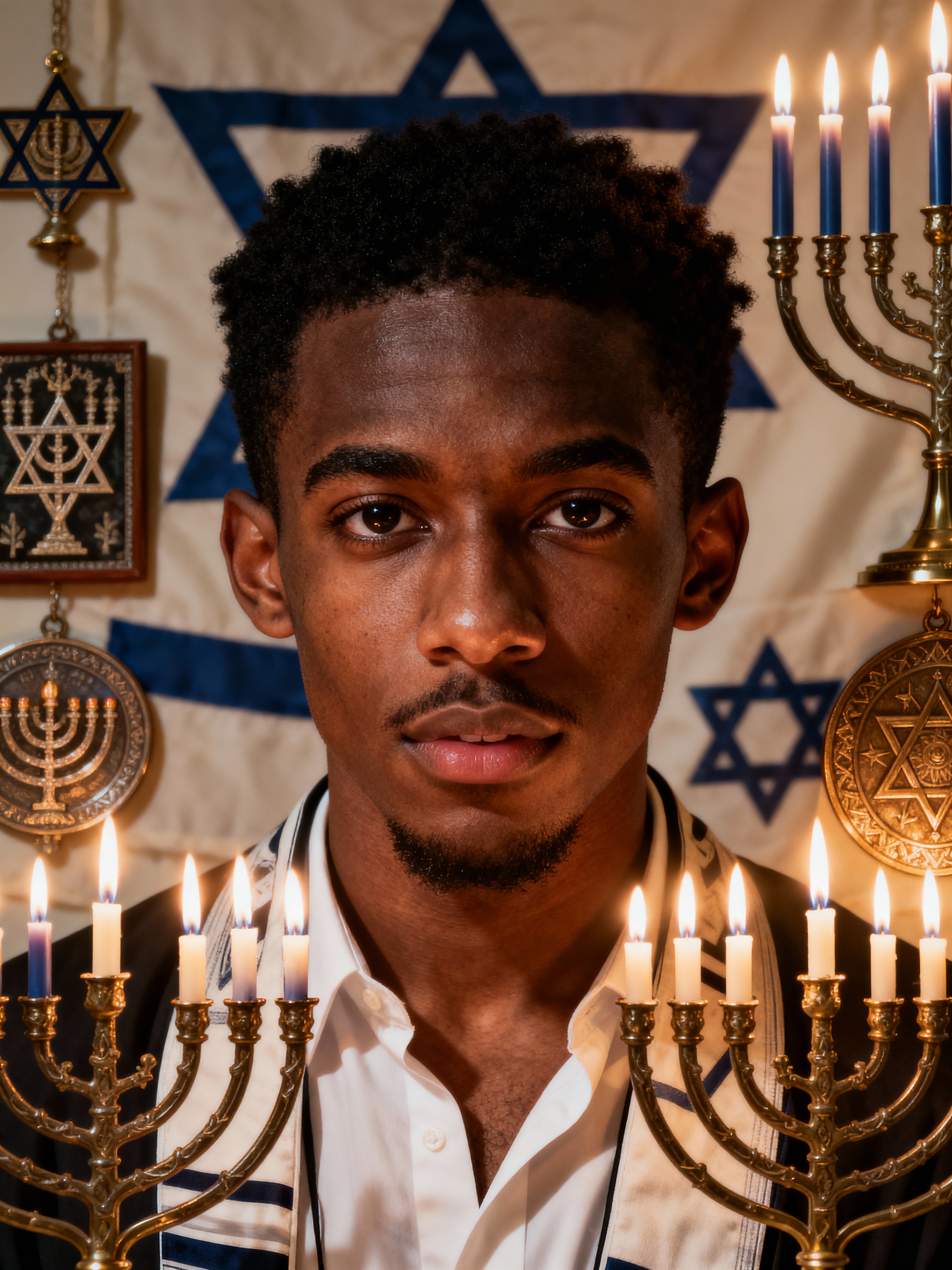 a stunning model surrounded by traditional symbols and menorahs, capturing the sense of miracle and family connection during the Festival of Lights