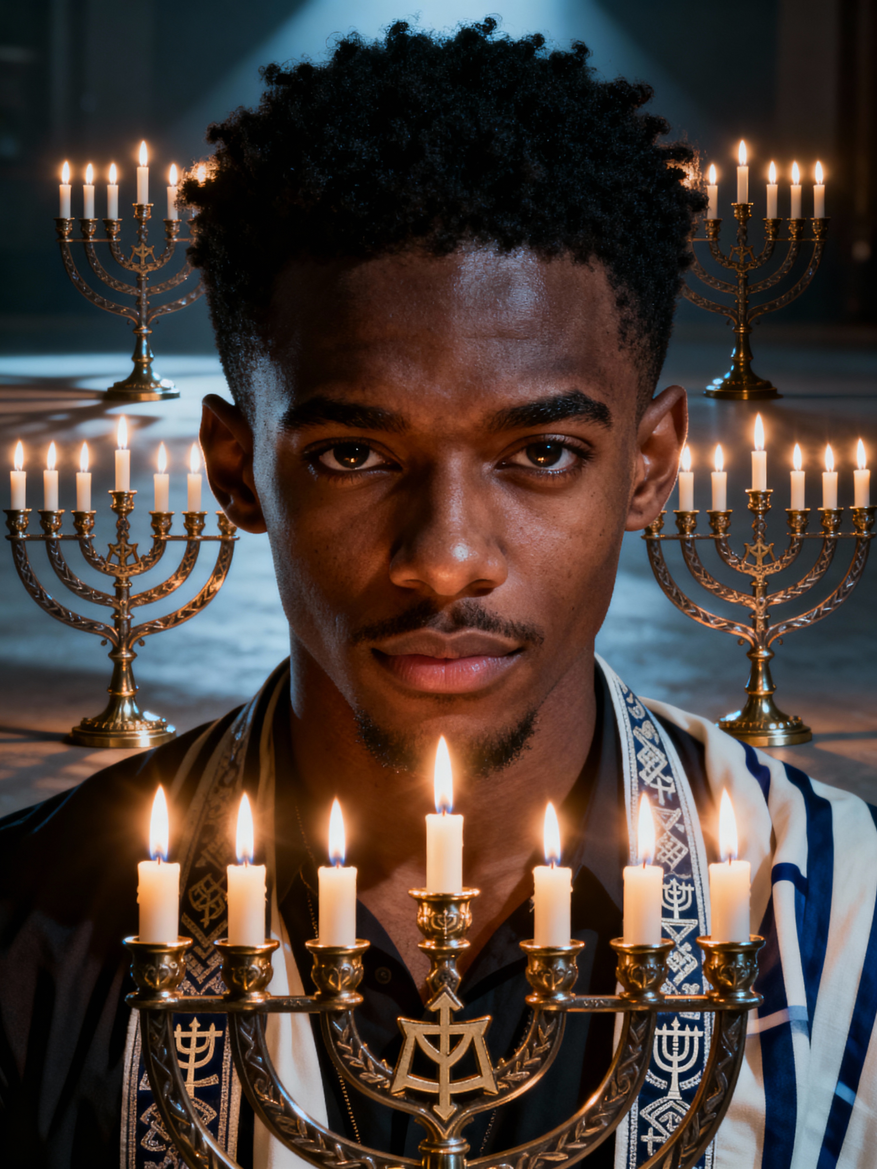 a stunning model surrounded by traditional symbols and menorahs, capturing the sense of miracle and family connection during the Festival of Lights