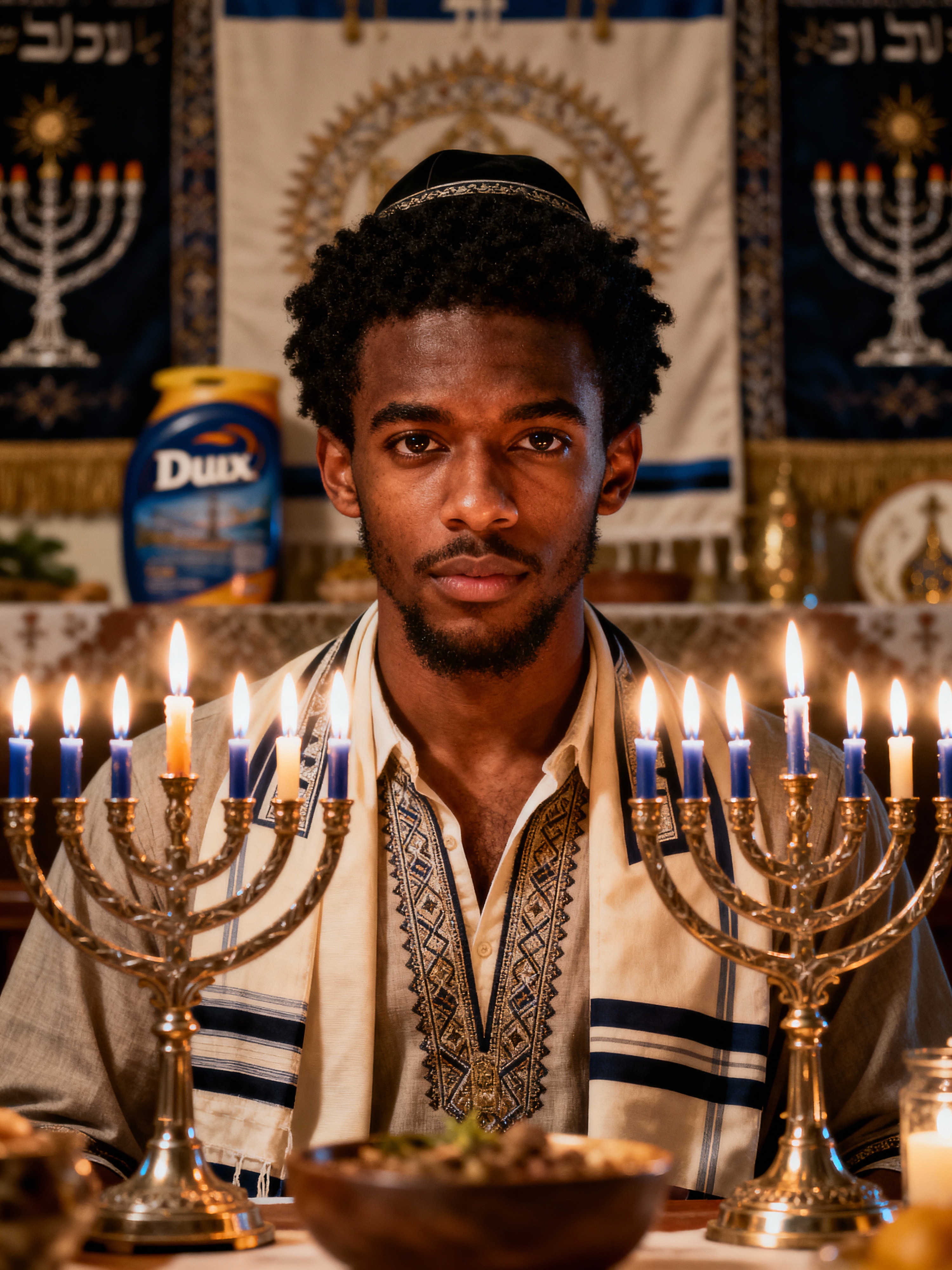 a stunning model surrounded by traditional symbols and menorahs, capturing the sense of miracle and family connection during the Festival of Lights