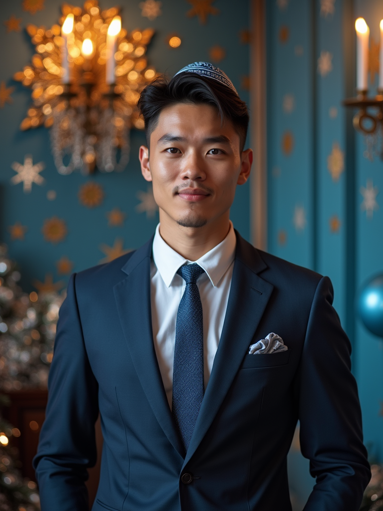a stunning model with a kippah and formal outfit, capturing the essence of Hanukkah traditions in a room decorated with Stars of David and blue and silver ornaments