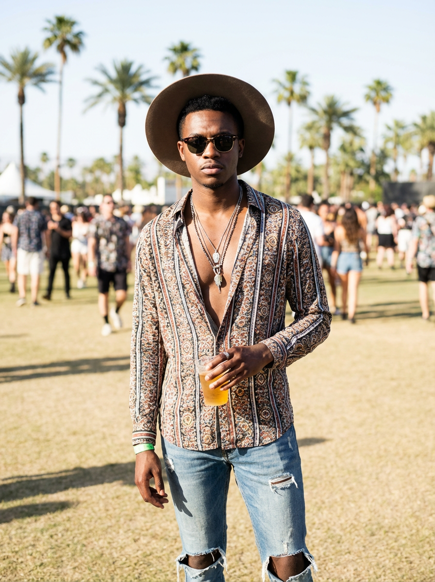 a stunning model with a stylish hat and sunglasses, capturing the essence of Coachella fashion in the California desert