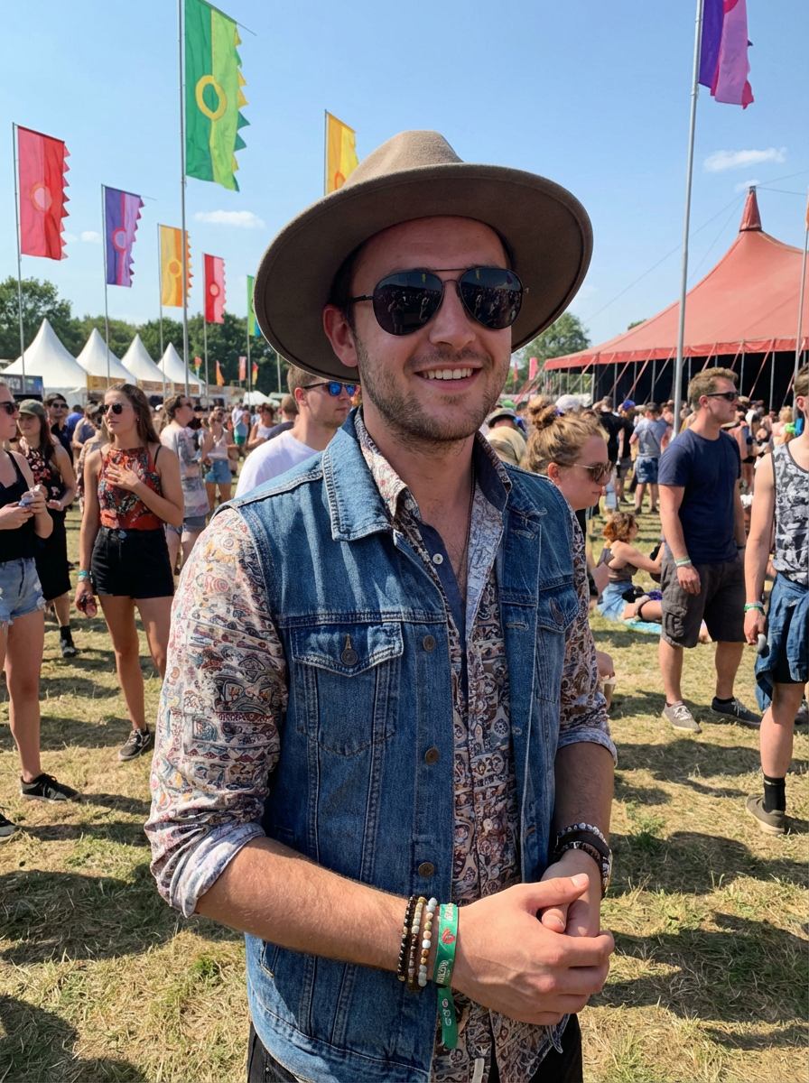 a stunning model with a stylish hat and sunglasses, capturing the essence of festival fashion and individuality