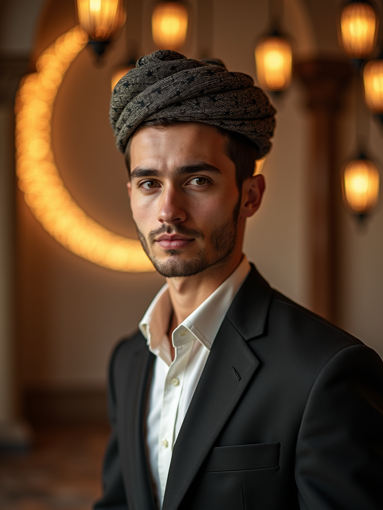 a stunning model with a traditional cap and formal outfit, capturing the essence of Ramadan traditions in a room decorated with crescent moons and stars
