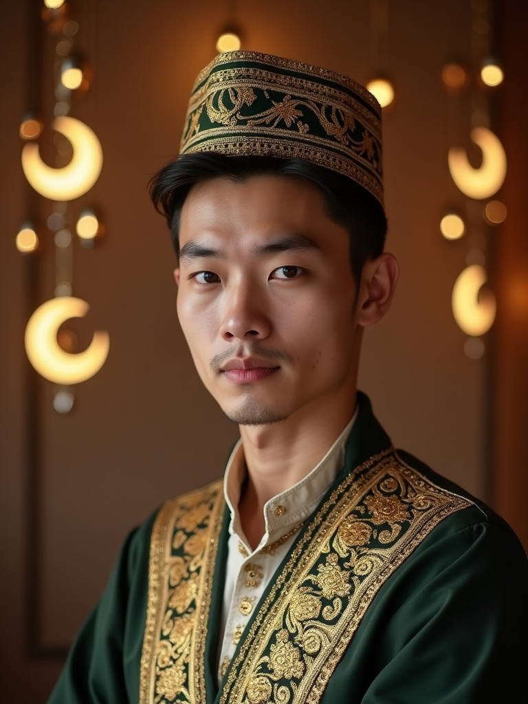 a stunning model with a traditional cap and formal outfit, capturing the essence of Ramadan traditions in a room decorated with crescent moons and stars