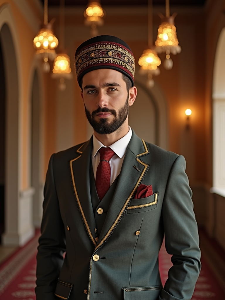 a stunning model with a traditional cap and formal outfit, capturing the essence of Eid traditions in a room decorated with crescent moons and stars