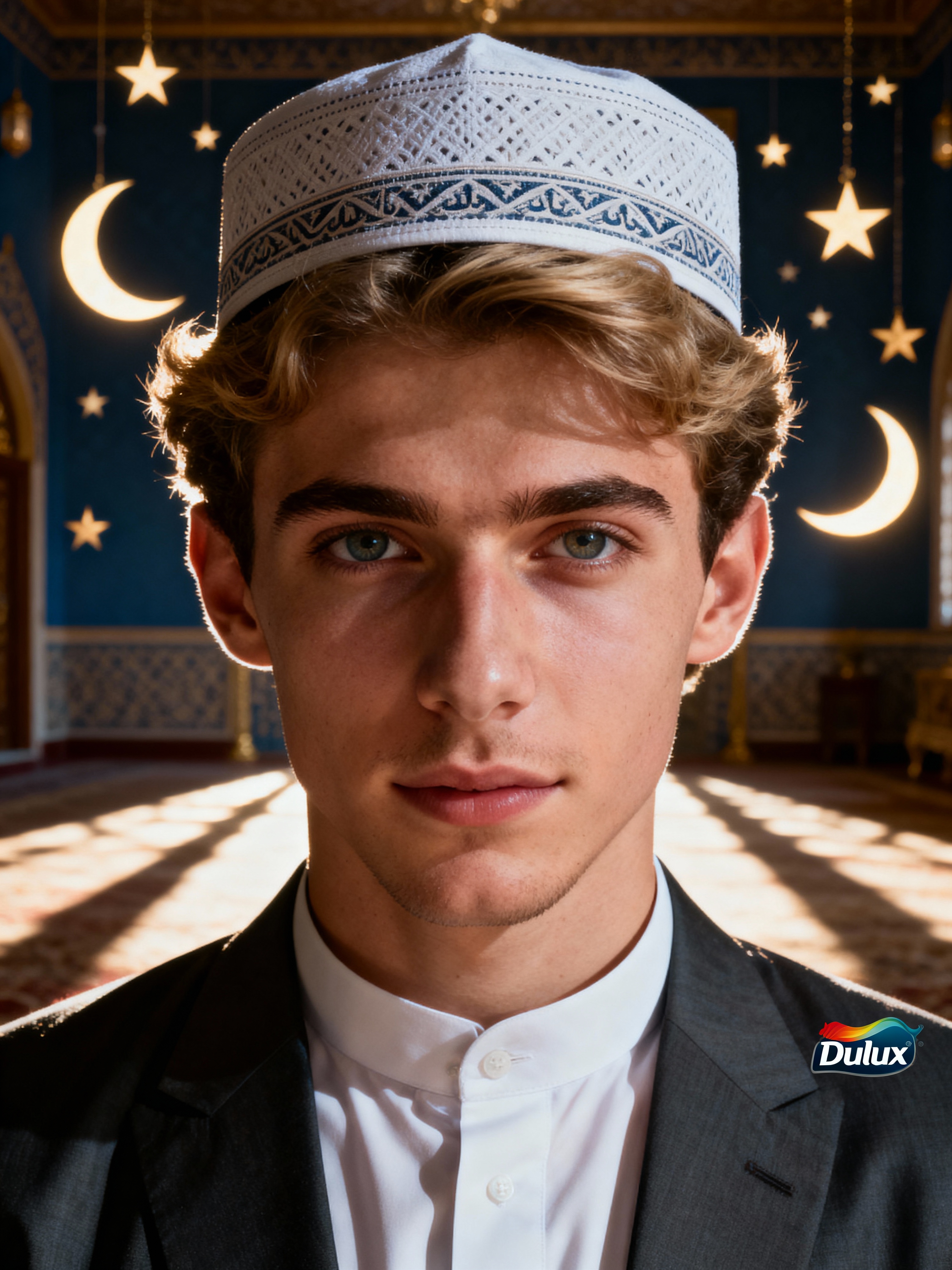 a stunning model with a traditional cap and formal outfit, capturing the essence of Eid traditions in a room decorated with crescent moons and stars