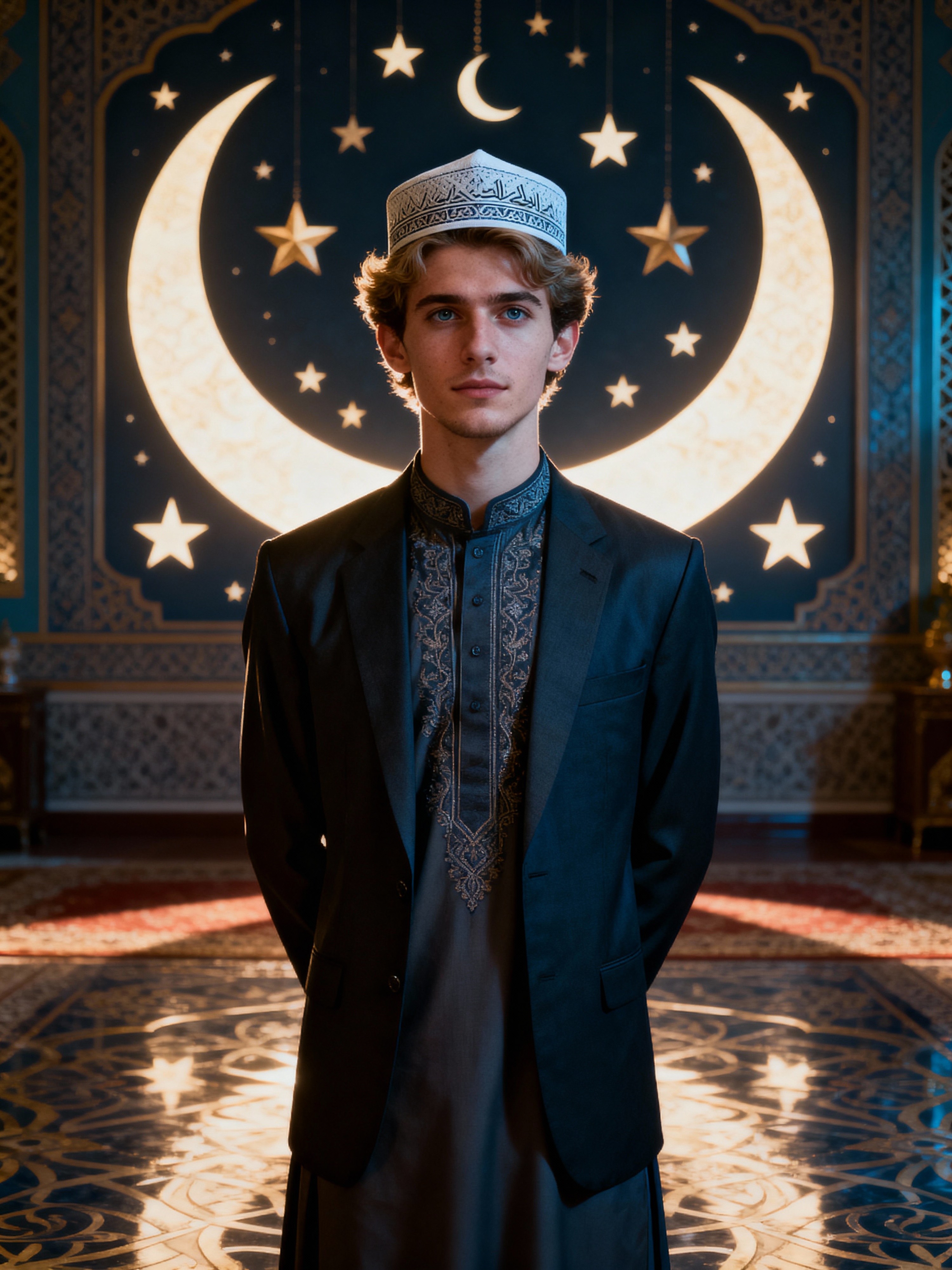 a stunning model with a traditional cap and formal outfit, capturing the essence of Eid traditions in a room decorated with crescent moons and stars