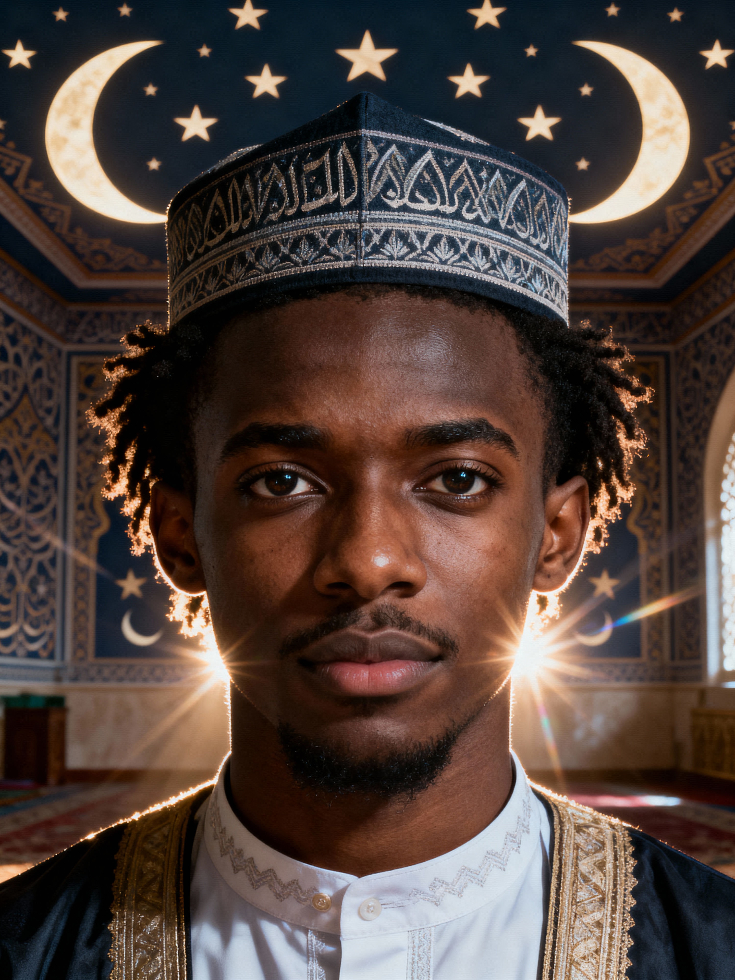 a stunning model with a traditional cap and formal outfit, capturing the essence of Eid traditions in a room decorated with crescent moons and stars