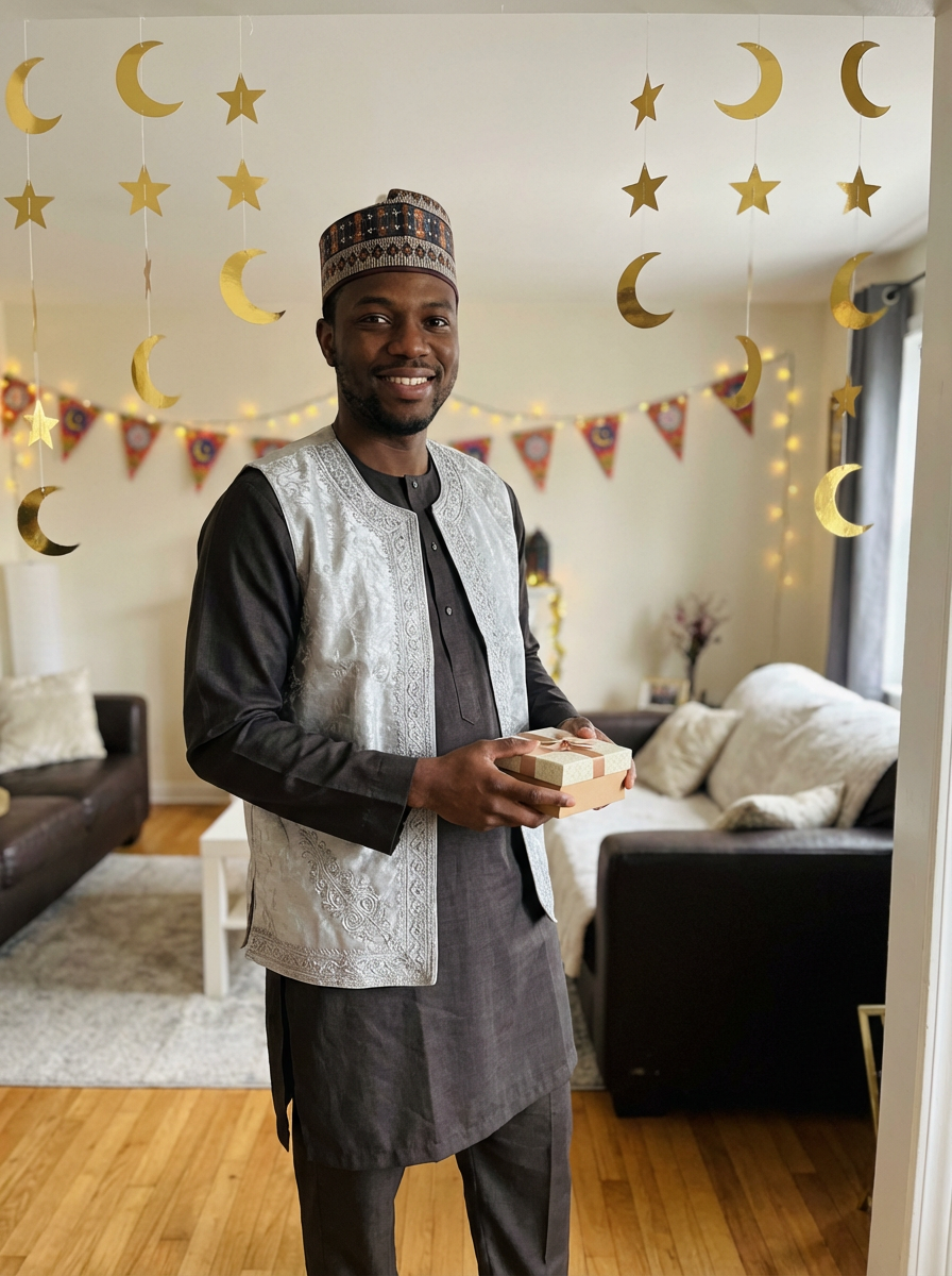 a stunning model with a traditional cap and formal outfit, capturing the essence of Eid traditions in a room decorated with crescent moons and stars