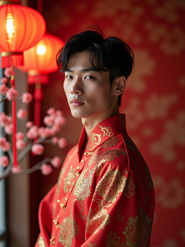 a stunning model with a traditional look with modern touches, capturing the essence of Lunar Chinese New Year traditions in a room decorated with plum blossoms and paper-cut decorations