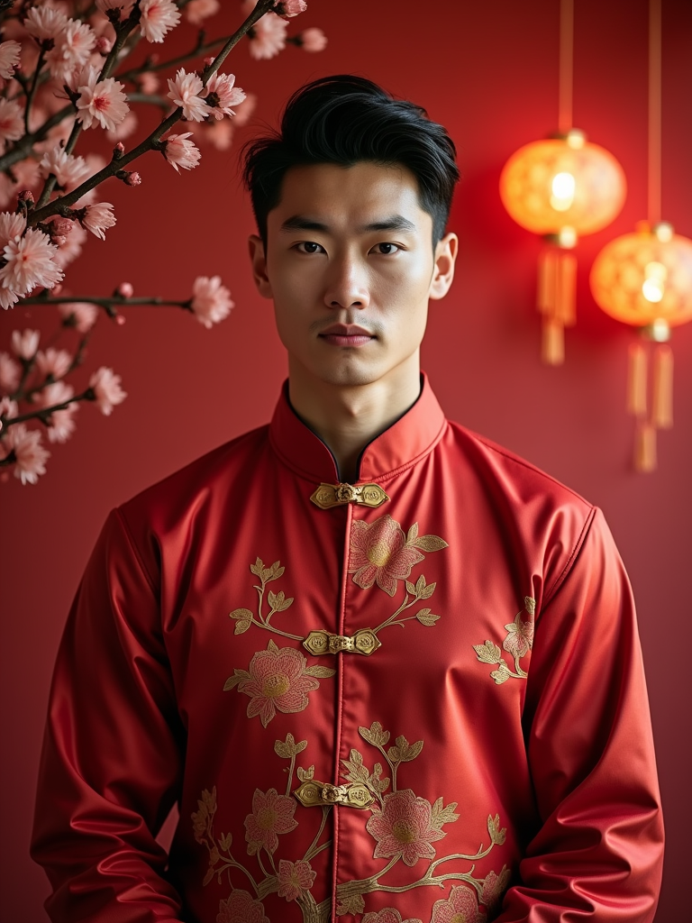 a stunning model with a traditional look with modern touches, capturing the essence of Lunar Chinese New Year traditions in a room decorated with plum blossoms and paper-cut decorations