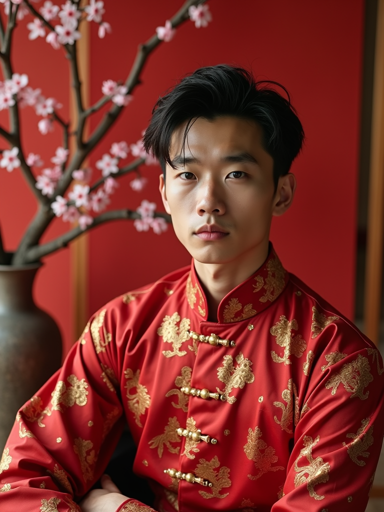 a stunning model with a traditional look with modern touches, capturing the essence of Lunar Chinese New Year traditions in a room decorated with plum blossoms and paper-cut decorations