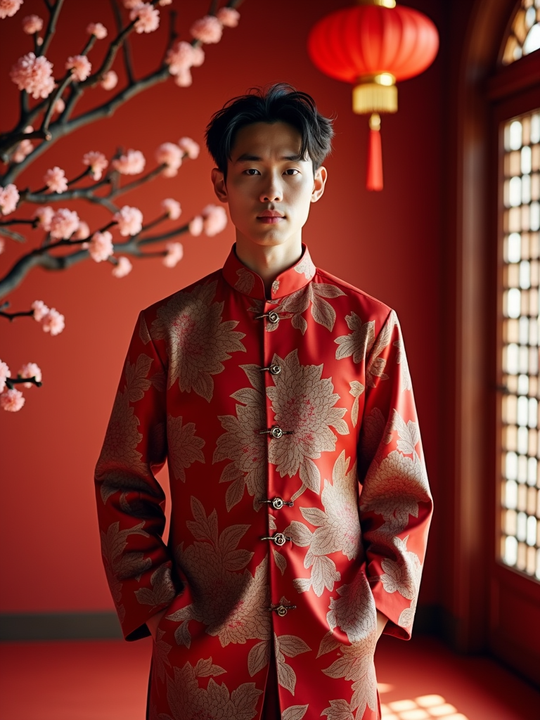 a stunning model with a traditional look with modern touches, capturing the essence of Lunar Chinese New Year traditions in a room decorated with plum blossoms and paper-cut decorations