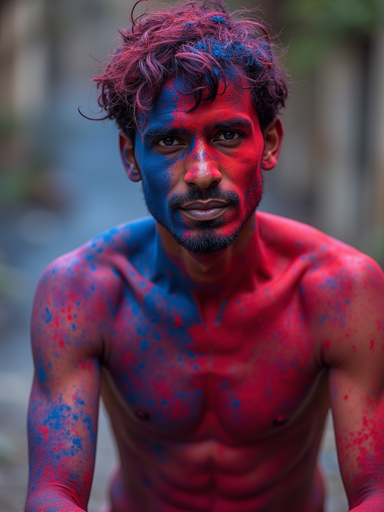 a stunning model with face and arms covered in red and blue Holi powders, capturing the essence of this ancient Hindu celebration