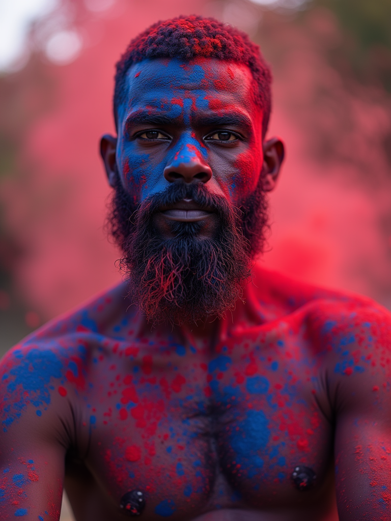 a stunning model with face and arms covered in red and blue Holi powders, capturing the essence of this ancient Hindu celebration