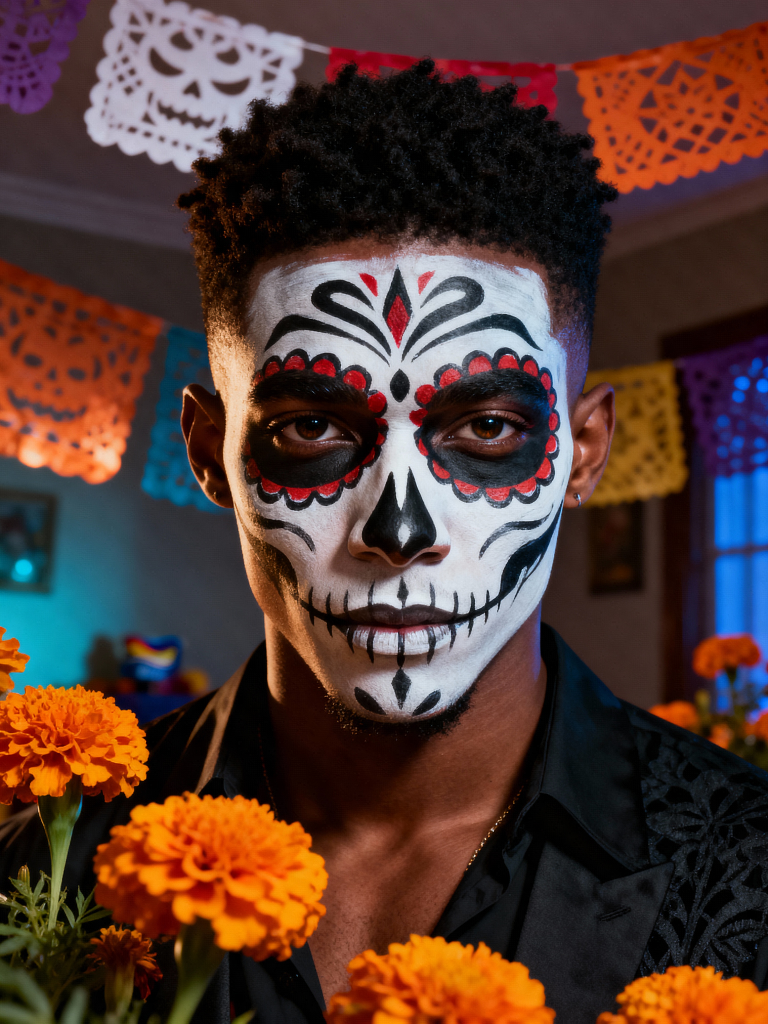 a stunning model with face painted as a traditional sugar skull with bold patterns, capturing the essence of Día de los Muertos in a room decorated with papel picado and marigold flowers
