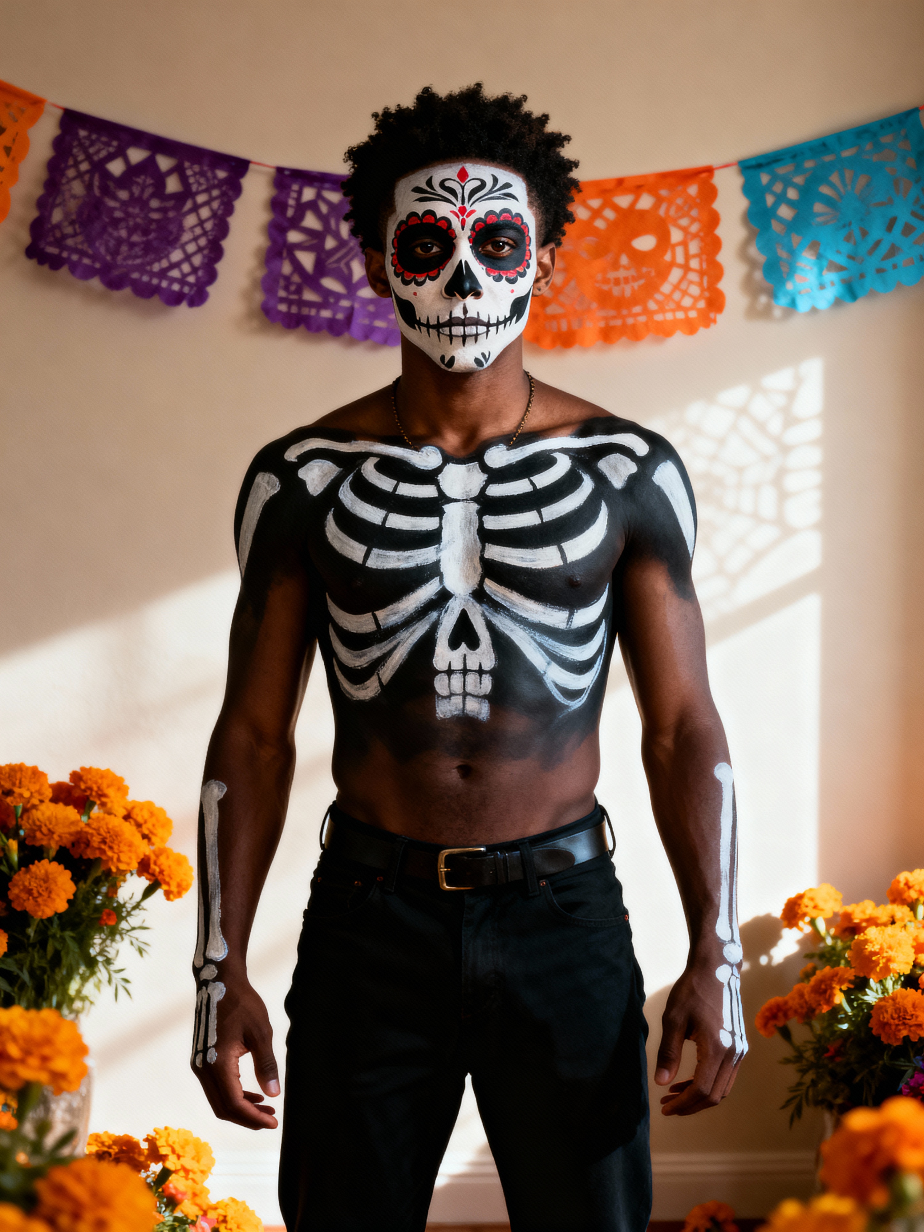 a stunning model with face painted as a traditional sugar skull with bold patterns, capturing the essence of Día de los Muertos in a room decorated with papel picado and marigold flowers
