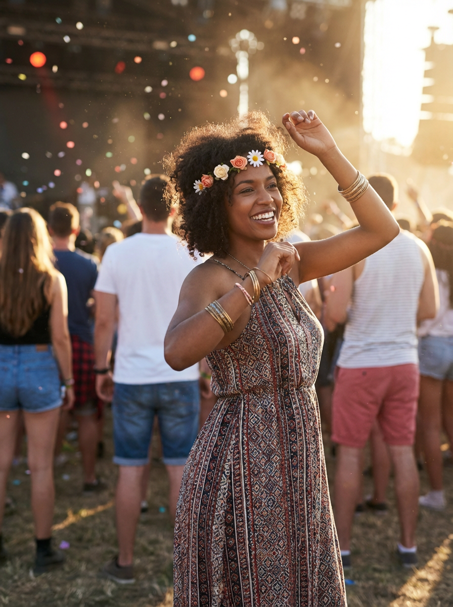 a stunning model as a festival-goer, dancing and enjoying the music in a vibrant crowd, wearing a boho chic dress and flower crown