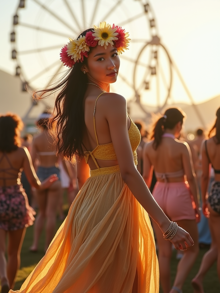 a stunning model at Coachella music festival, dancing and enjoying the music in a vibrant crowd, wearing a boho chic dress and flower crown , with the iconic Coachella ferris wheel in the background