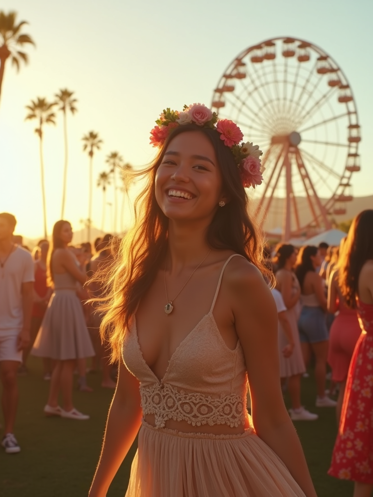 a stunning model at Coachella music festival, dancing and enjoying the music in a vibrant crowd, wearing a boho chic dress and flower crown , with the iconic Coachella ferris wheel in the background