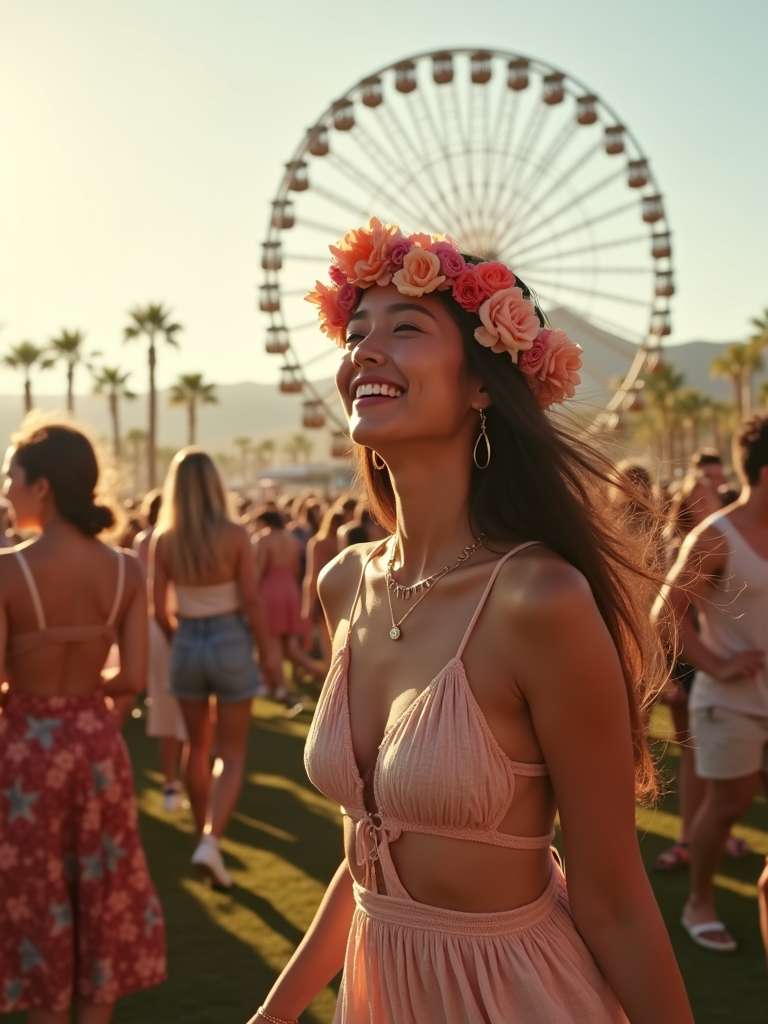 a stunning model at Coachella music festival, dancing and enjoying the music in a vibrant crowd, wearing a boho chic dress and flower crown , with the iconic Coachella ferris wheel in the background