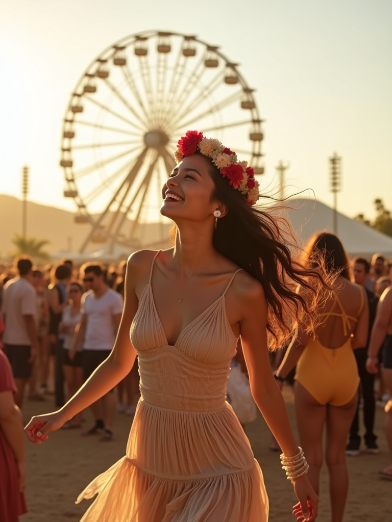 a stunning model at Coachella music festival, dancing and enjoying the music in a vibrant crowd, wearing a boho chic dress and flower crown , with the iconic Coachella ferris wheel in the background