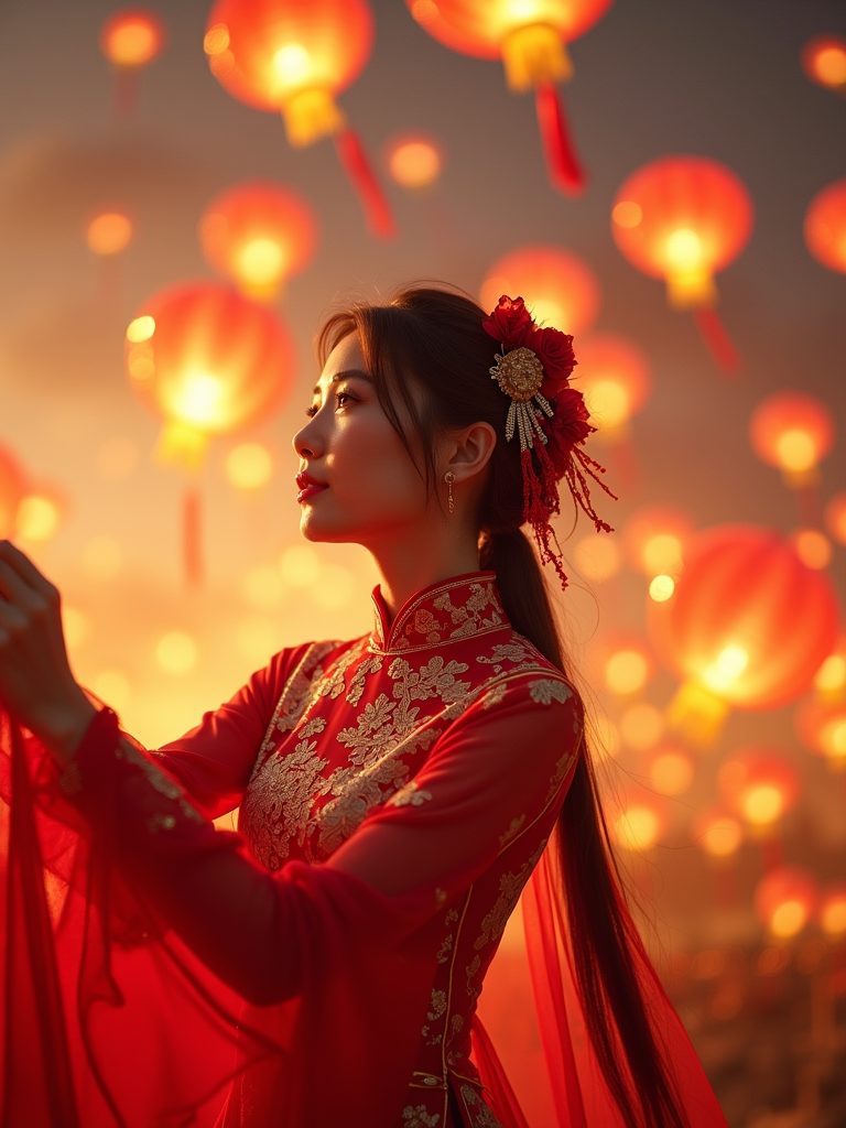 a stunning model celebrating Chinese New Year, sky full of traditional floating lanterns, wearing a beautiful qipao dress in red and gold