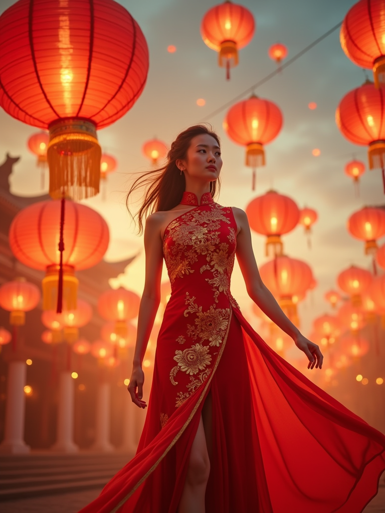 a stunning model celebrating Chinese New Year, sky full of traditional floating lanterns, wearing a beautiful qipao dress in red and gold